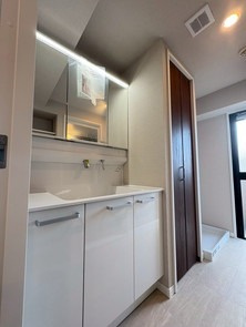 三面鏡裏収納付きの洗面台で、散らかりがちな洗面回りもすっきりと片付きます