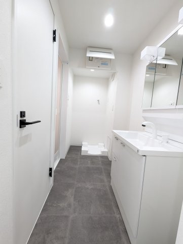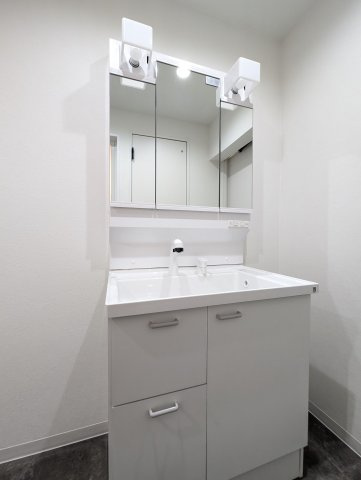 三面鏡裏収納付きの洗面台で、散らかりがちな洗面回りもすっきりと片付きます
