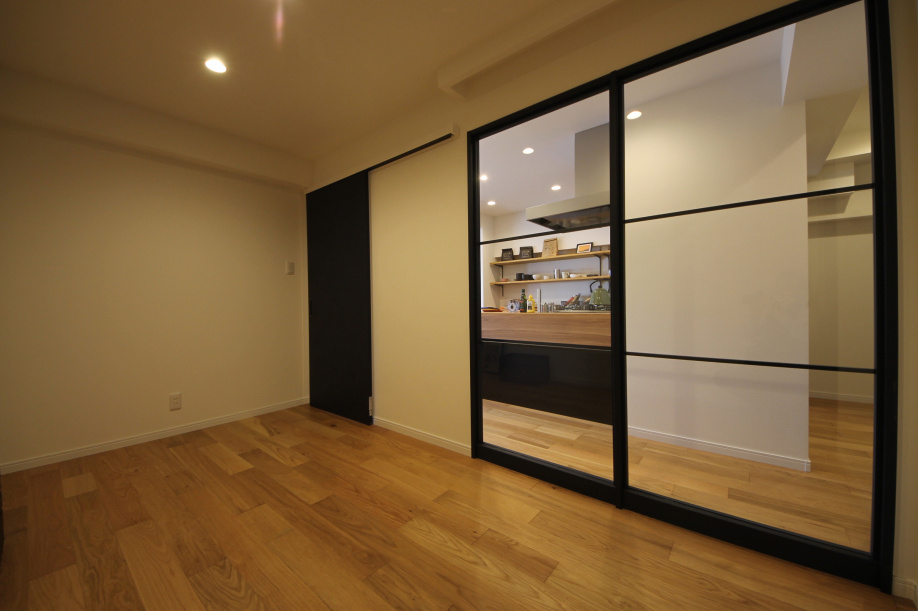 寝室は仕切り戸をクリアにすることで広さく見せています。